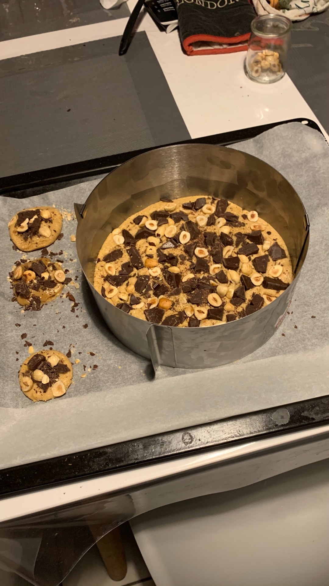 • Posez un cercle de 20cm de diamètre sur une plaque recouverte de papier sulfurisé/silpat et pochez la pâte à cookie dans ce cercle.